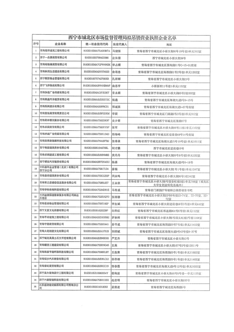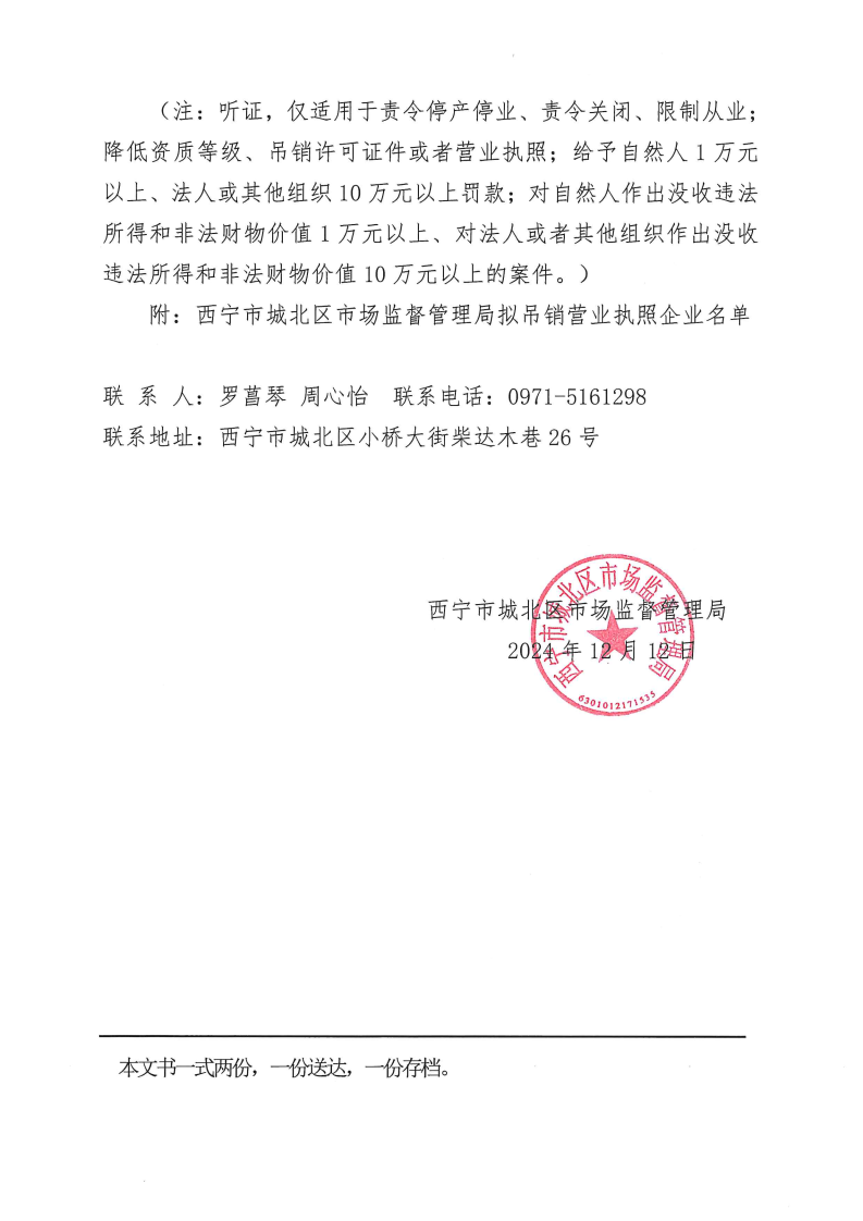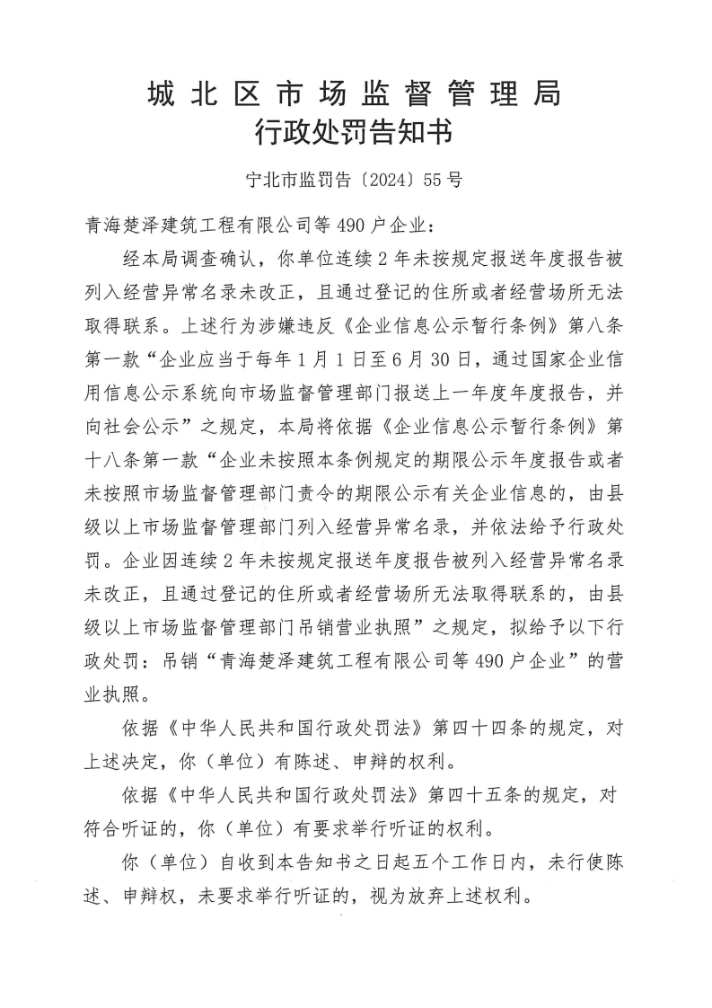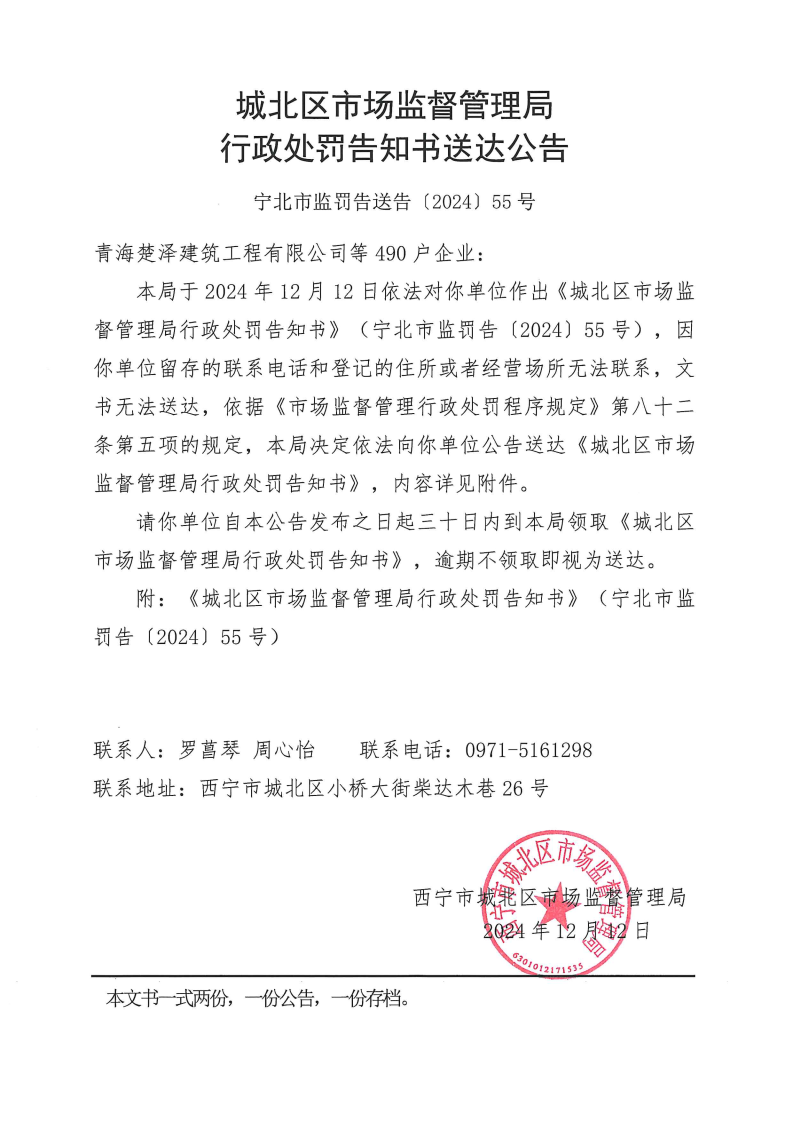 城北区市场监督管理局行政处罚告知书送达公告 宁北市监罚告送告(2024)55号